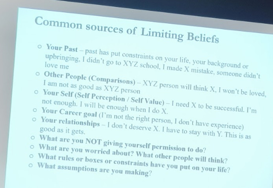 Towards the end of the Quarter, I attended a workshop on “Limiting Beliefs” with Graham Weaver, one of the GSB’s rockstar professors. It left many of us in tears. Graham’s point was that limiting beliefs are self-fulfilling: 75% of our thoughts are negative, and 80% are repeated from the day before. These beliefs reside in our subconscious ‘lizard brain.’ The goal of meditation is to make these beliefs visible so they lose their power.